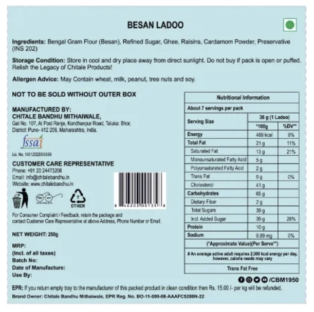 Chitale Besan Ladoo is a nutritioud Indian treat prepared with roasted gram flour, ghee, and sugar. These golden ladoos, infused with ghee's nutty scent and a melt-in-your-mouth texture, are the perfect combination of flavor and tradition, suitable for festivals or a sweet pleasure at any time.